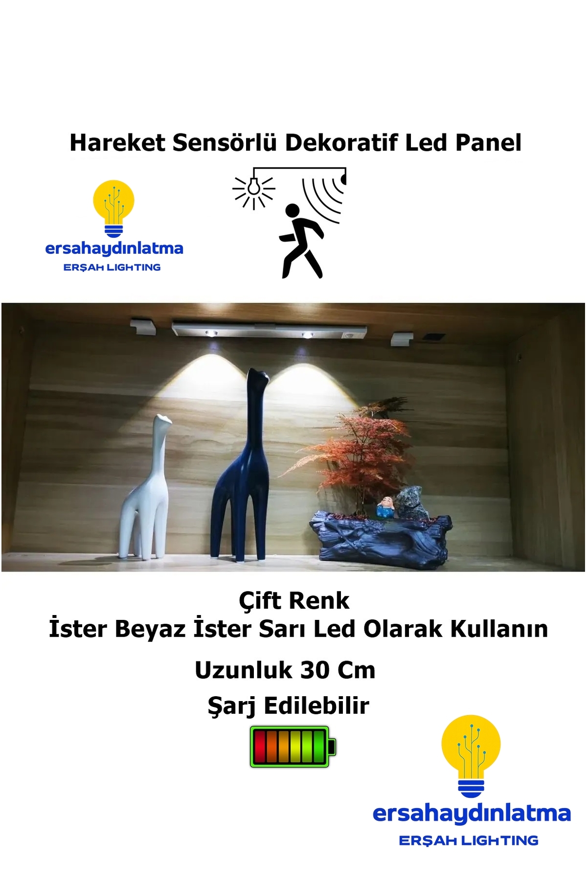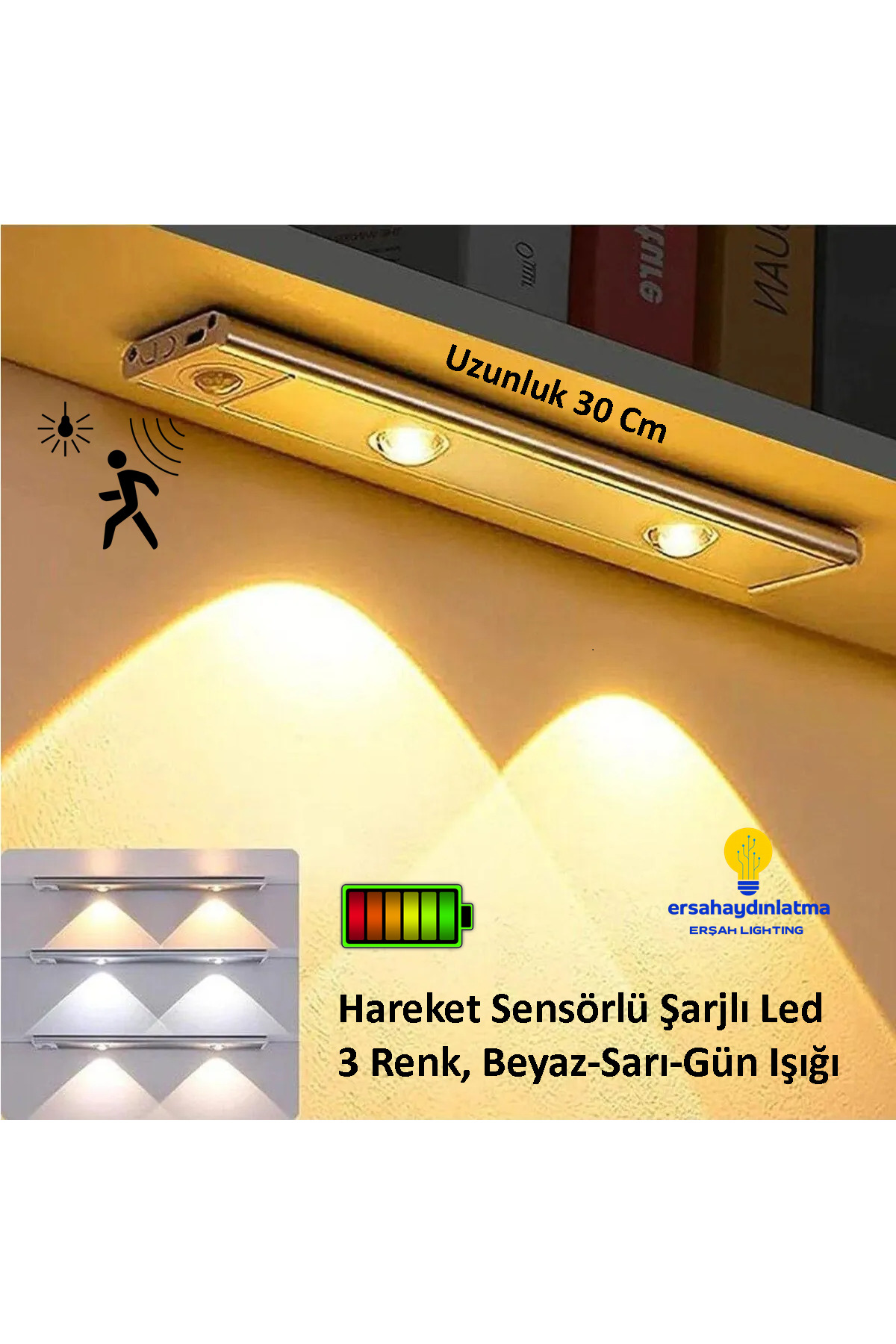 Led lamba hareketlerinize duyarlı vücut indüksiyonları ile çalışarak etrafı aydınlatır.; ; Ürünün uzunluğu 30 cm dir.; ; Led rengi ayarlabilir ister gün ışığı ister beyaz ister iki rengi aynı anda yakabilirsiniz.; ; Karanlıkta ihtiyacınız olan anlarda çalışan sensörlü lamba yatak odası, bebek odası, banyo, mutfak, dolap içi, bagaj, merdiven gibi yerler için idealdir.; ; Yüksek kaliteli led ile rahat görüş sağlayan yumuşak ışık saçar.; Manuel olarak açma/kapama düğmesini kullanarak çalışır, lamba algılama sensörleri ile kendiliğinden açılır ve kapanır.; ; 3 kademeli çalışma prensibine sahiptir.; Kapama, Otomatik Sensörlü Yanma, Açma.; ; Tam Şarj süresi 1 saat / Akım: 2A/ Şarj Voltaji: 5V Geniş hareket algılama aralığına sahip led sensörlü lamba 0-5 metreye kadar vücut hareketlerinizi algılayarak ışık verir.; ; Otomatik lambanızı zemini delmeden, kırmadan yapışkanlı tasarımı sayesinde saniyeler içerisinde çok kolay monte edebilirsiniz rahatlıkla söküp tekrardan yuvaya oturtabilirsiniz .; ; USB kablo ile şarj edebilirsiniz.; Şarj sırasında kırmızı ışık yanacaktır, şarj dolumu tamamlandığı zaman kırmızı ışık sönecektir.; ;