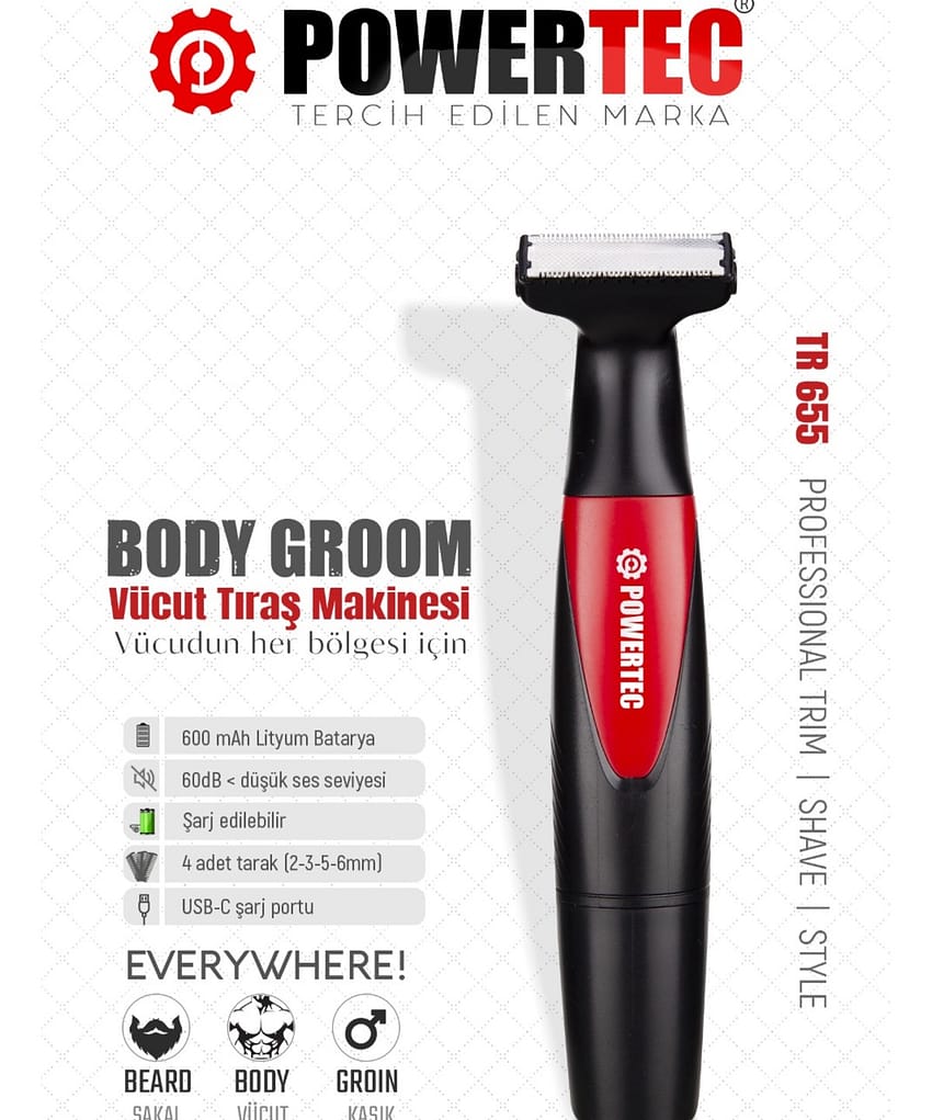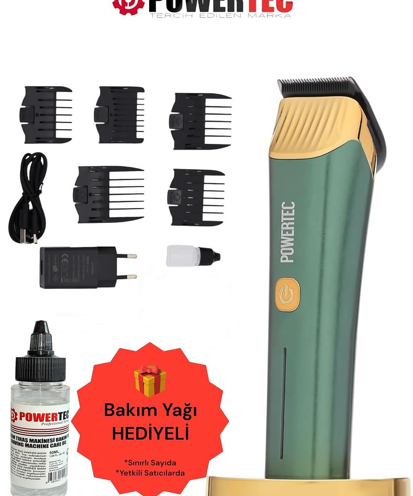 Powertec Traş Kakinası TR; 9900 Kullanım Alanları : Saç Tıraşı, Sakal Kısaltma Kullan Şekli : Kablosuz Stand (Oturaklı) : Var Standlı Standsız Şarj : Var Şarj Tipi : USB Type C (Adaptör dahil) Başlık Tipi : 440c Alman çelik Çıkarılabilir Bıçak : Evet Tarak Ölçüleri : 1,5mm, 3mm, 6mm, 9mm, 12mm Tarak Sayısı : 5 En Kısa Taraksız Kesme : 0,8 mm Taraksız Uzunluk Ayarlama : Çoklu kademe (0,8mm; 1; 2mm) Motor Gücü : 3; 7v/DC Motor Çalışma Tipi : Çift kademe Yedek Pil : Yok Pil Durumu : 2000mAh Lityum Batarya Tipi : Gömmeli Şarj Bildirim Led : Var (dolunca sabit beyaz) Çalışma Süresi : 4 Saat Şarj Süresi : 4; 5 Saat;;