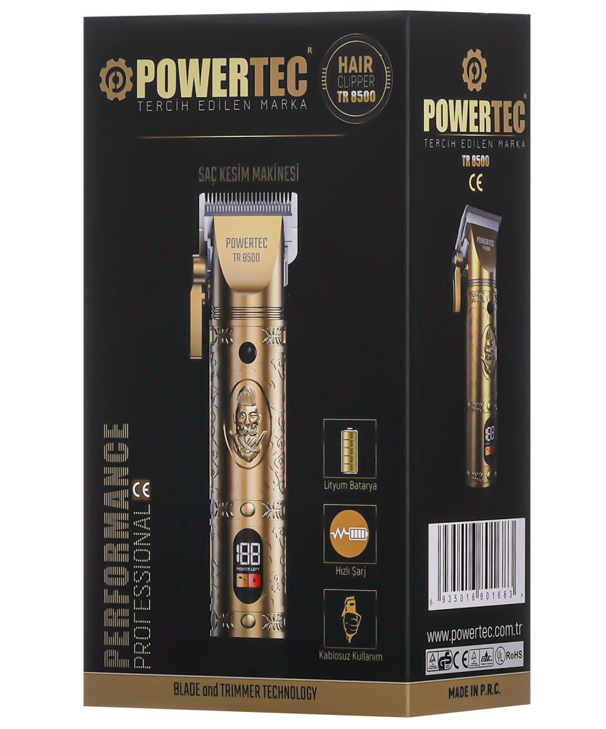 Powertec Traş Kakinası TR; 9900 Kullanım Alanları : Saç Tıraşı, Sakal Kısaltma Kullan Şekli : Kablosuz Stand (Oturaklı) : Var Standlı Standsız Şarj : Var Şarj Tipi : USB Type C (Adaptör dahil) Başlık Tipi : 440c Alman çelik Çıkarılabilir Bıçak : Evet Tarak Ölçüleri : 1,5mm, 3mm, 6mm, 9mm, 12mm Tarak Sayısı : 5 En Kısa Taraksız Kesme : 0,8 mm Taraksız Uzunluk Ayarlama : Çoklu kademe (0,8mm; 1; 2mm) Motor Gücü : 3; 7v/DC Motor Çalışma Tipi : Çift kademe Yedek Pil : Yok Pil Durumu : 2000mAh Lityum Batarya Tipi : Gömmeli Şarj Bildirim Led : Var (dolunca sabit beyaz) Çalışma Süresi : 4 Saat Şarj Süresi : 4; 5 Saat;;