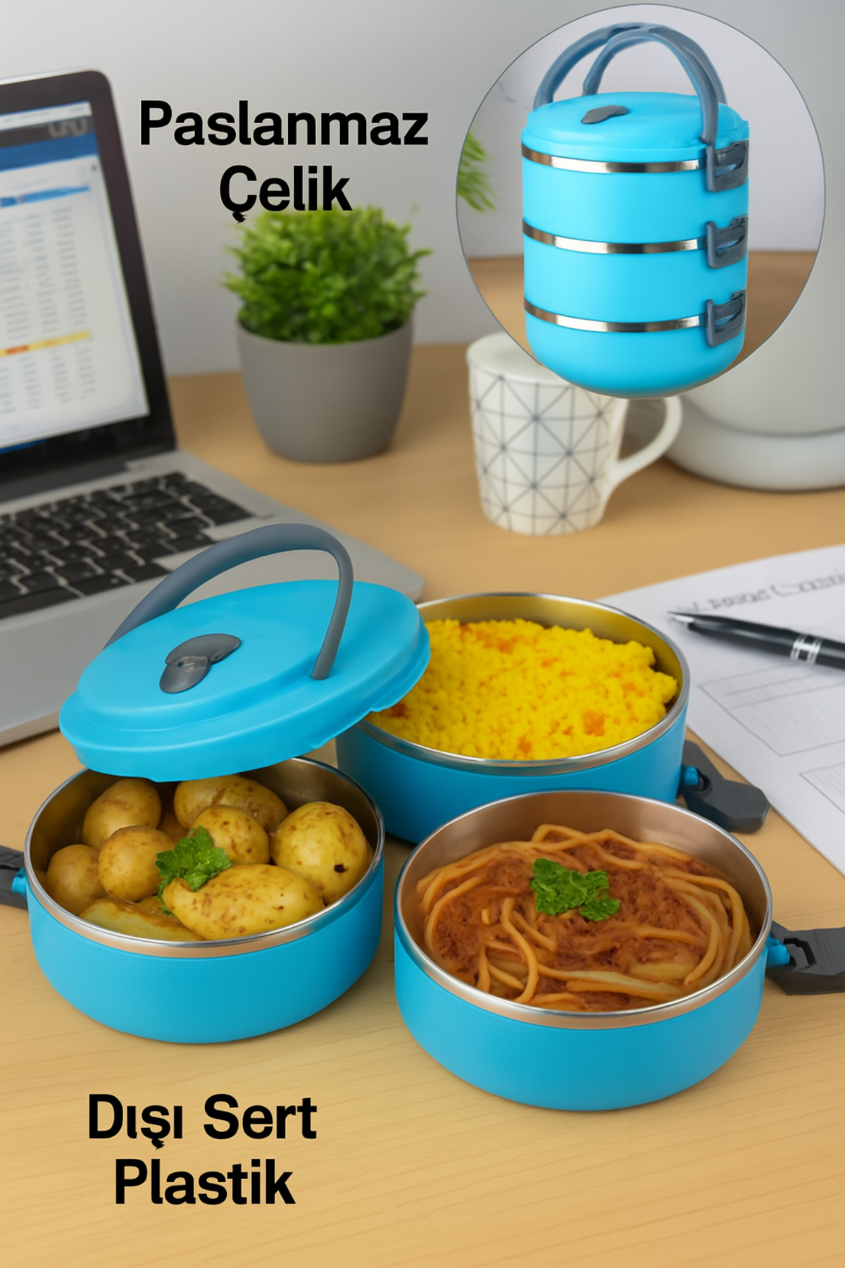 – Üç katmanlı tasarımı sayesinde, yemeklerinizi taze ve sıcak tutar.; – Paslanmaz çelik malzemesi ile uzun ömürlü kullanım sunar.; – Kolay temizlenebilir yapısı, hijyenik bir kullanım sağlar.; – Hafif ve dayanıklı yapısıyla seyahatlerde rahatlıkla taşınabilir.; Stokta olan renk gönderilir Açık Mavi, Koyu Mavi, Pembe renkleri mevcut olup istediğiniz rengi sipariş sorularından yazın seçer varsa istediğiniz rengi göndeririz.; Gıdaya uygundur